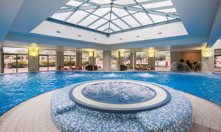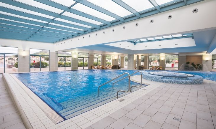 The hotel boasts an extensive range of facilities designed for both relaxation and active pursuits. Guests can enjoy indoor and outdoor swimming pools with sunbathing terraces, well-maintained tennis courts, a multipurpose playground, and a comprehensive wellness centre featuring Turkish baths, saunas, and multiple treatment rooms, all set against the backdrop of the scenic bay.