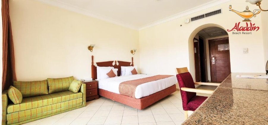 The Aladdin Beach Resort is located approx. 17 km from the city centre. On the beach are sun loungers, sun umbrellas and beach towels available. Cold drinks are served at the beach bar. The hotel has a 24-hour reception, a lobby bar, a supermarket, a boutique, a cash machine, a hairdresser, a jacuzzi as well as parking spaces. In the outdoor area, you will find a garden as well as a pool (open all year), where sun loungers and pool towels are available for free. For children, there is also a children’s pool.