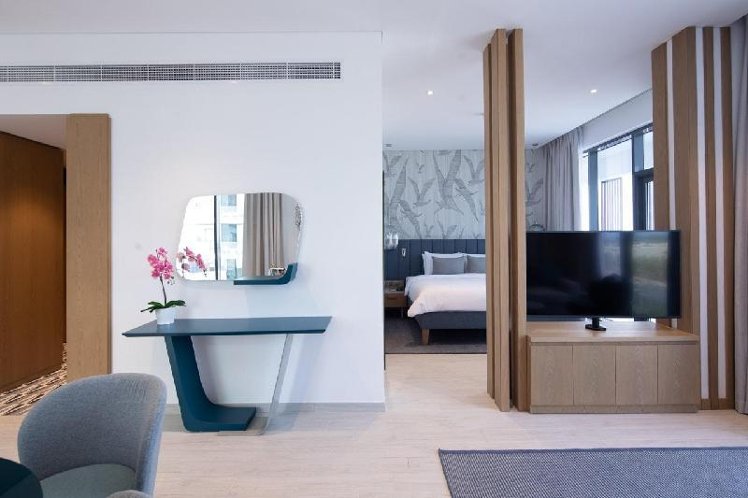 With living room, king size bed, baby cot (for free), balcony or terrace, heating (individually adjustable), kettle (for free), minibar (for a fee), capsule coffee machine (for free), internet (for free), safe (for free) and flat screen cable TV as well as centrally controlled air conditioning. Bathroom with bathtub and shower.