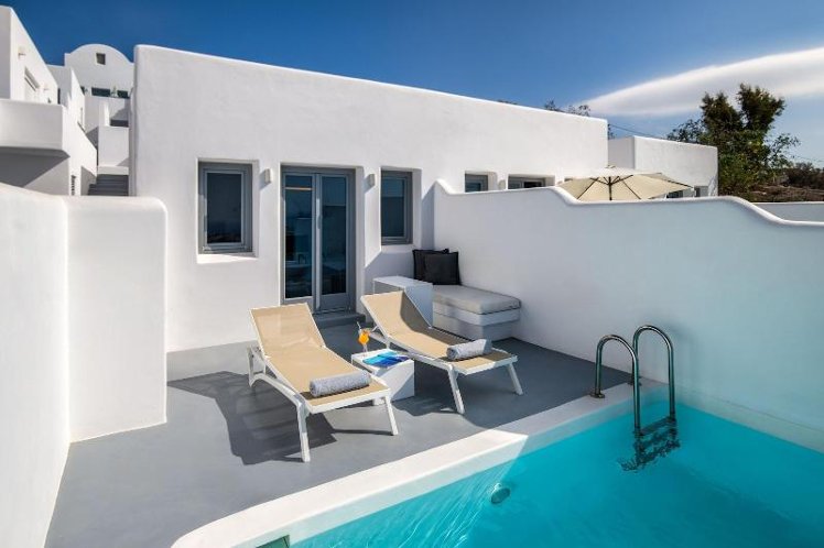 The villa is comprised of two traditional concierge suites, with an outdoor heated jacuzzi and two spacious patios where guests can enjoy undisturbed views of Santorini. Our suites are crafted in traditional style and combine the warmth of Greek Island charm with the convenience of modern amenities.