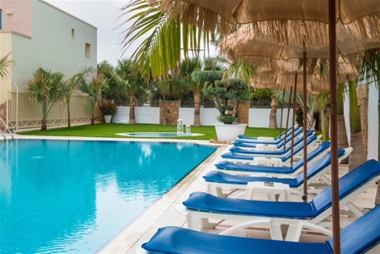 Just a 10 min walk from the village of Malia and 34km East of Heraklion international airport direct on the sandy beach is situated the Malia beach hotel. The famous palace is a short drive from the hotel. The hotel comprises seven separate low level buildings with well tended gardens and flowers between them.The Malia Beach hotel apart from the nice location and great accommodation standards has pool, Tennis court, Mini golf, Table tennis, billiard, children’s playground, gymnastic, beach volley, water polo, boccia and darts. There are also available to all guest the hotel’s restaurant, bar, tavern and pool bar as well where guest can enjoy a refreshing drink.All the 280 comfortable beautifully designed rooms offer furnished terraces and balconies, with spectacular views of the sea and the gardens. Every room is fully equipped with bathroom, A/C , satellite TV, safety deposit box (extra charge), bathroom, direct dial telephone, refrigerator and hairdryer.