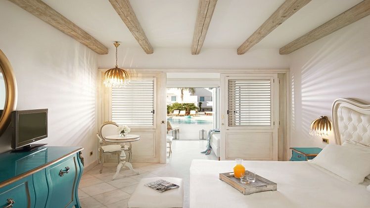 The rooms at Mitsis Selection Laguna are designed with luxury and comfort in mind, featuring modern furniture, air-conditioning, and private balconies or terraces. Accommodation options range from stylish Twin Land View rooms to opulent Royal Suites. Guests can enjoy amenities such as Nespresso machines, daily stocked minibars, and satellite TV. Family rooms offer separate sleeping areas, making them ideal for those travelling with children. For a more exclusive experience, the resort also offers bungalows with private whirlpool spas or shared pool access, providing added privacy and relaxation.