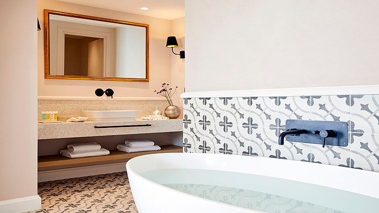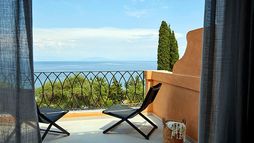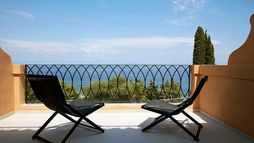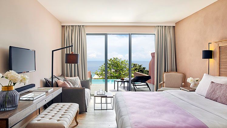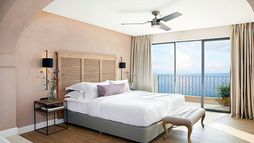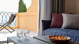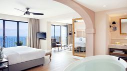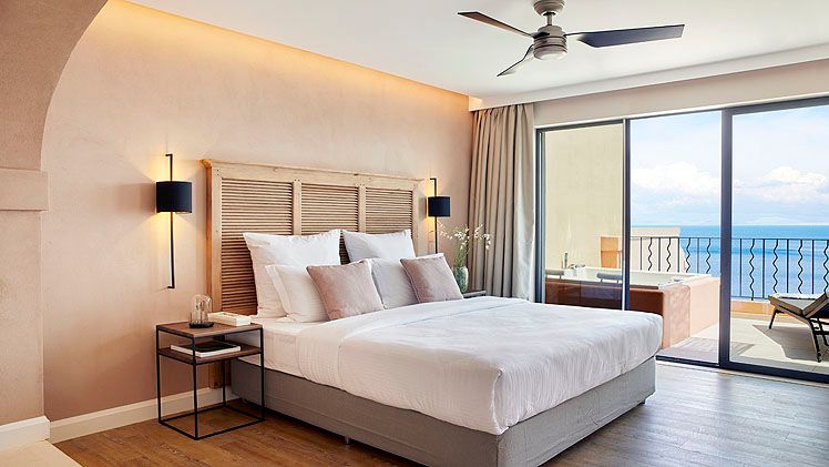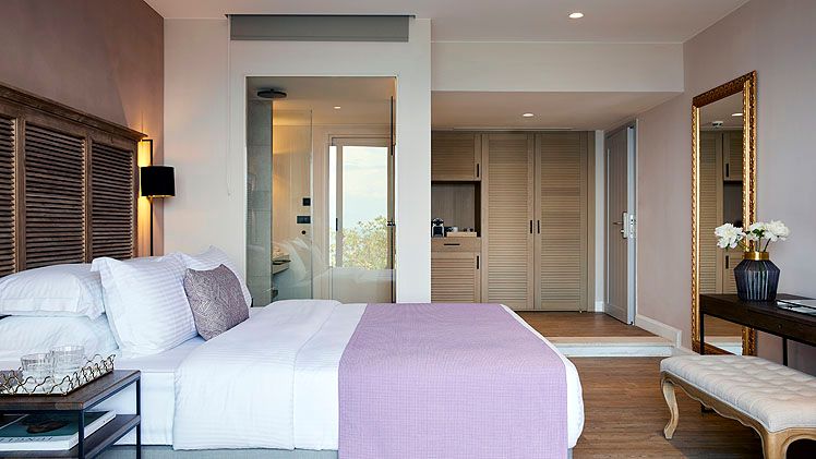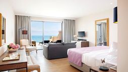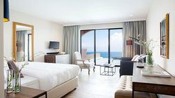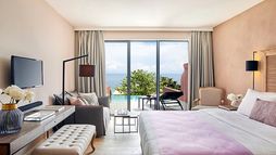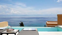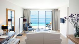 Guest suites are styled with contemporary interiors and designed to make the most of sea views, each offering a private veranda furnished for outdoor relaxation and many featuring their own private pool or whirlpool. Accommodation categories range from junior suites with sea views to expansive suites with separate lounge areas and generous outdoor terraces, all intended to deliver privacy and a comfortable adult-only stay. In-room dining is available, and suites are finished to reflect the hotel’s modern approach to seaside living.