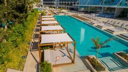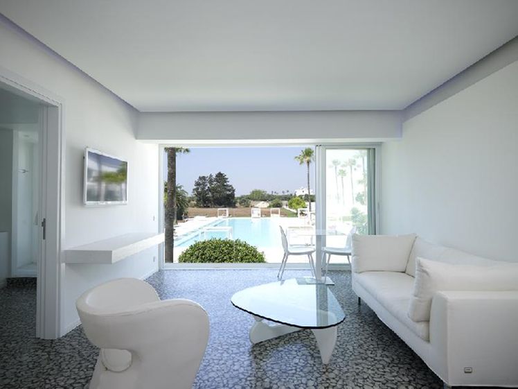 The hotel is decorated with modern furniture and bright colours. Its outdoor bar offers Mediterranean Sea views. In addition to a lobby area with 24-hour reception and check-out services, currency exchange desk and a cloakroom, further facilities available to guests at this air-conditioned, 45-room beach hotel include a café, 3 restaurants and both wired and wireless Internet access. Furthermore, guests can take advantage of room and laundry services and there is a cellar for storing bicycles, as well as a bike hire service. Those arriving by car may leave their vehicles in the hotel car park.