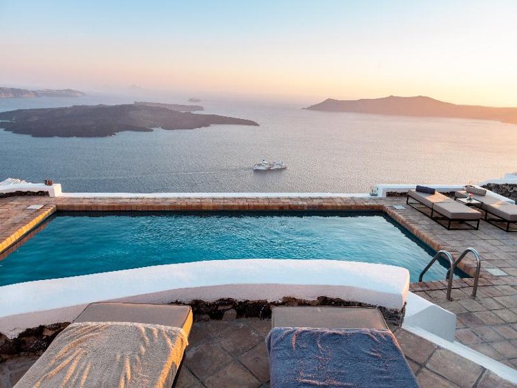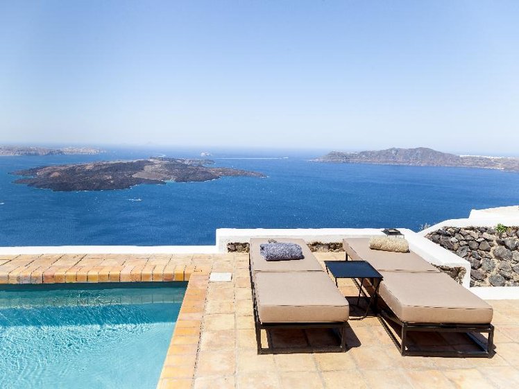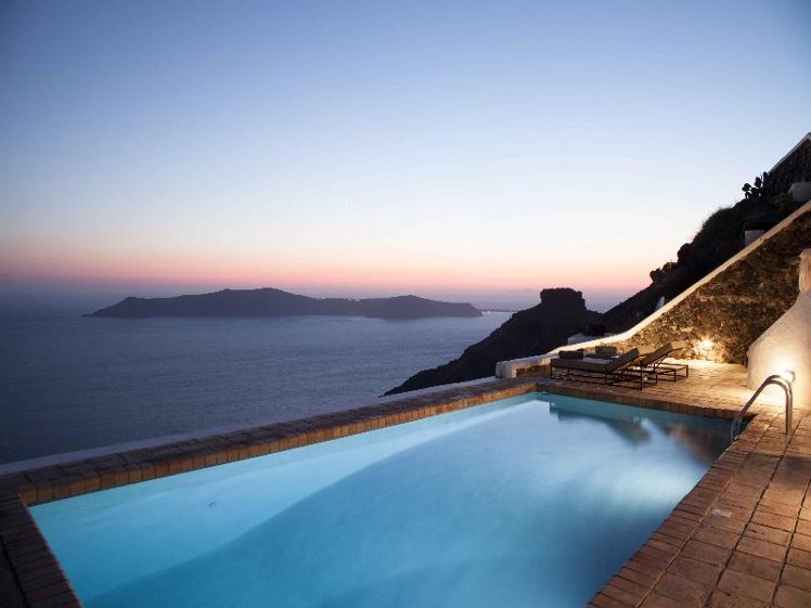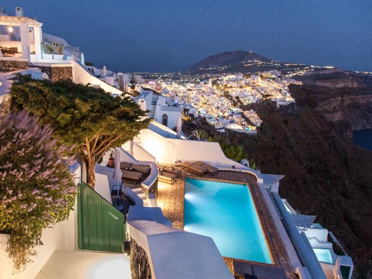 The Vasilicos is a converted family house, formally the prized sanctuary of a passionate art collector. It has been fully renovated, and furnished with vintage and custom-made items from the family's private collection. Ideally located in the middle of the Caldera rim, at the highest point of the Caldera cliff, The Vasilicos offers privileged views of the volcano and surrounding islands. The Vasilicos is in between, and at walking distance from, the villages of Firostefani and Imerovigli, while the capital Fira is a 20-minute walk. Access to the hotel is very easy, and the hotel's private parking lot is adjacent to the property. Seven suites (four with outdoor jacuzzis), all with private terraces and perfect views, large heated pool, complimentary room service breakfast, free WiFi and parking, easy access, 24-hour reception, honeymoon packages.